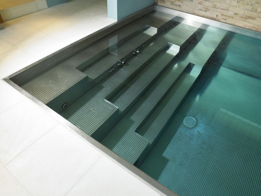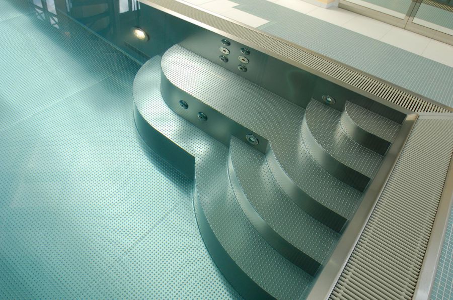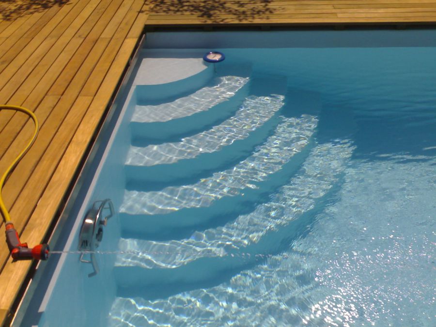 Die überwiegende Zahl der von uns gebauten Schwimmbäder ist rechteckig - auch weil sich diese Beckenform am einfachsten abdecken lässt (Sicherheit, Energieeinsparung).Es sind, neben Edelstahlleitern als preiswerteste Variante, die verschiedensten Treppenformen möglich: